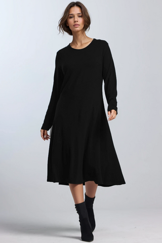 Effortless, elegant, and endlessly wearable—the A-Line Swing Flared Dress is your ultimate winter layering hero. Cut from premium New Zealand Merino, this long-sleeve style flatters the figure with a softly flared silhouette that moves as you do. A rounded neckline adds a clean finish, while the length makes it ideal with ankle boots or sneakers alike. Available in classic Black and Navy, it's a cold-weather essential you'll reach for again and again.