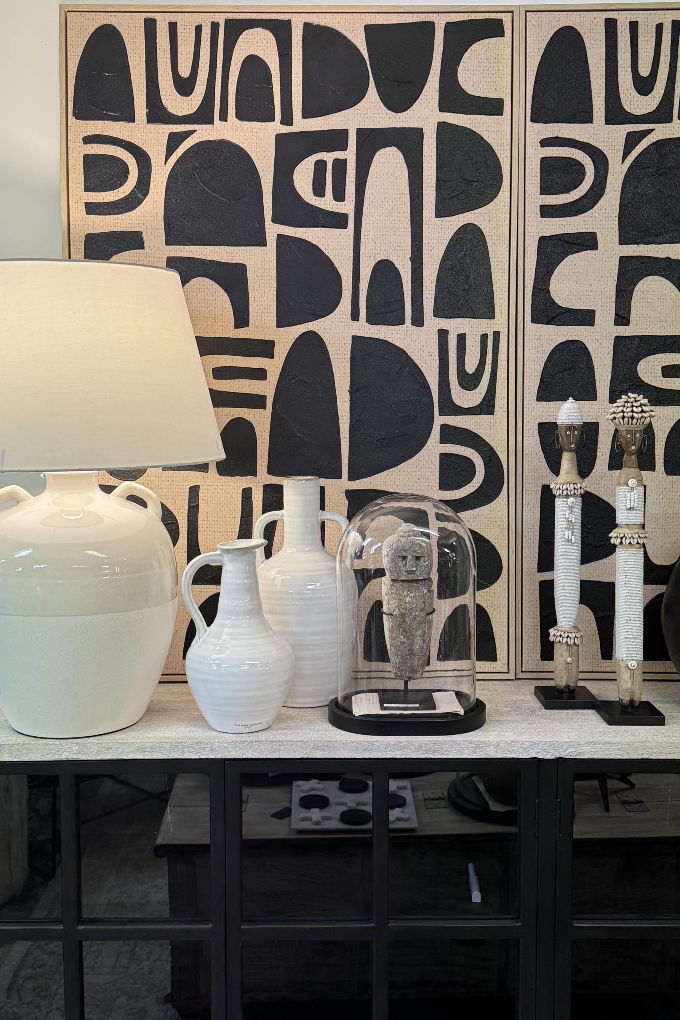 Striking in its simplicity, this abstract print features bold black shapes arranged in rhythmic repetition against a natural-toned backdrop. The interplay of arches, curves and geometric forms creates a sense of movement and balance, perfect for contemporary spaces seeking a graphic focal point with a modernist edge.