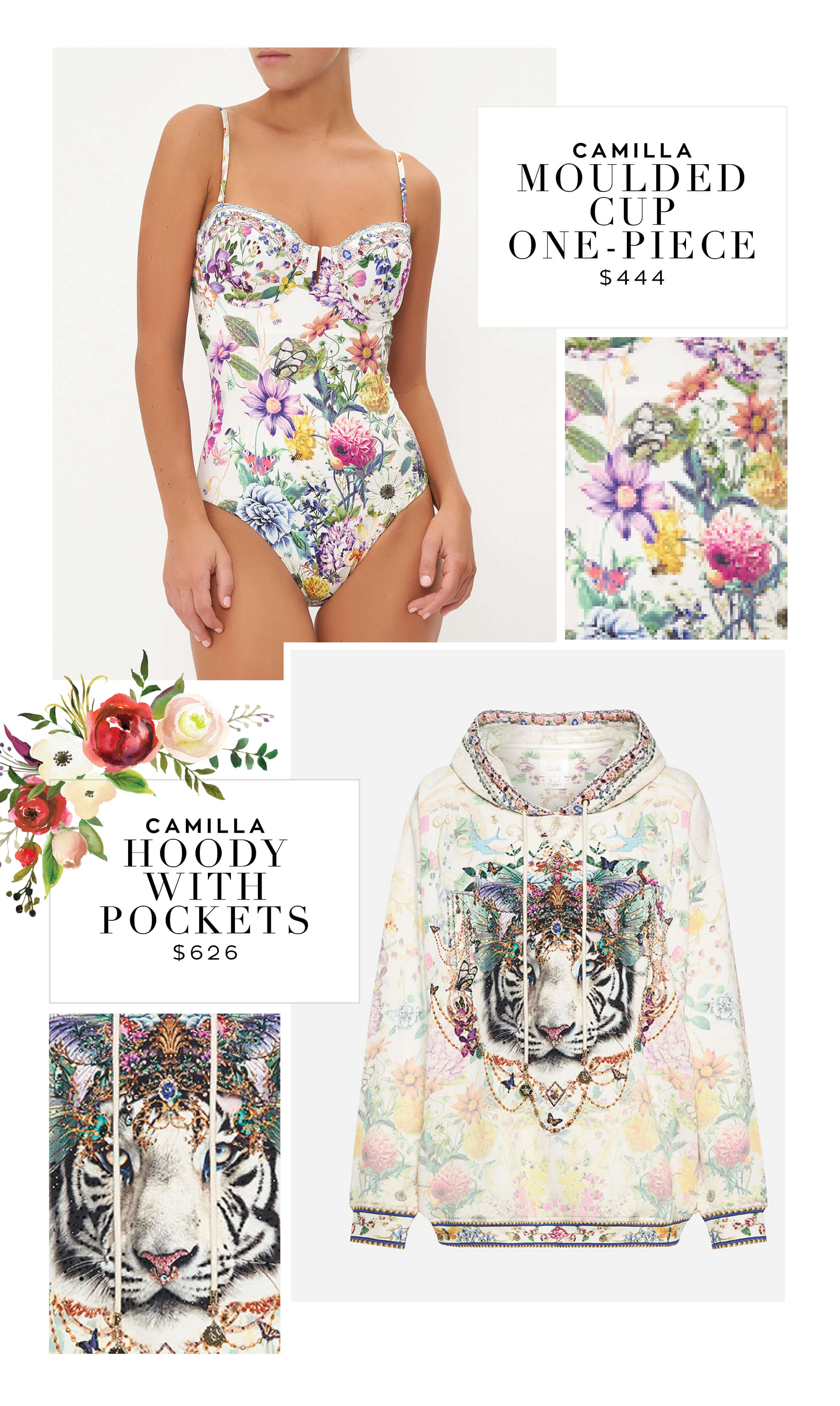 Transporting the imagination to soft ethereality, the Queens Bee Hive Hoody With Pockets steals the gaze with an ivory mosaic spotted with dreamy butterflies, cascades of bubblegum botanicals and our signature tiger portrait adorned in mariposa majesty. Crafted from breathable cotton, this luxury hoodie is home to silk lining within the hood and pockets, an oversized silhouette, ribbed details, drawstring adjustability, tassel accents and hand-embellished CAMILLA crystals.