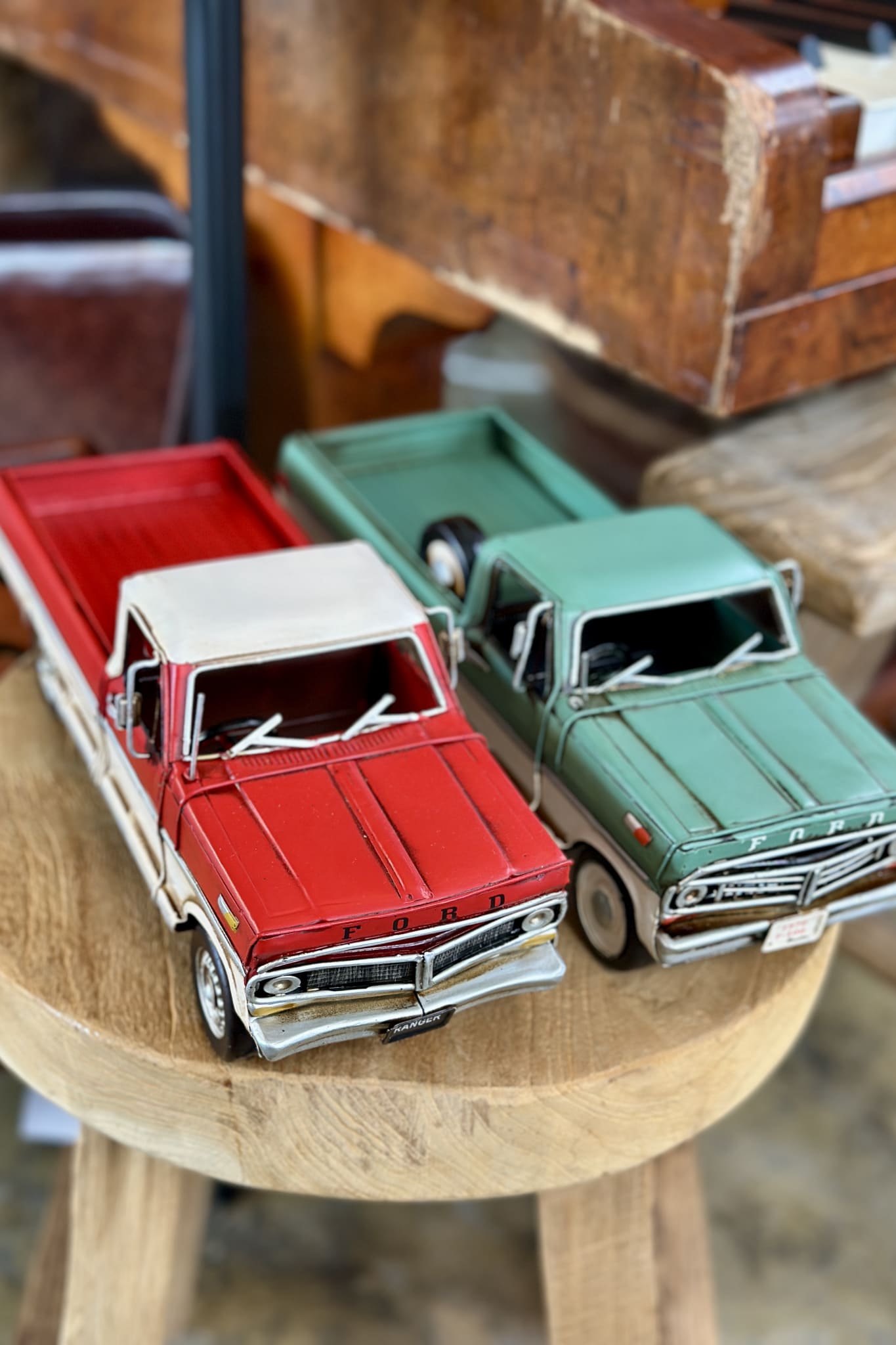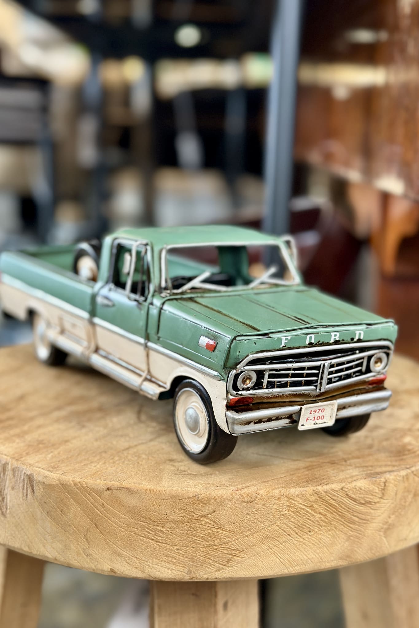 A vintage-style Ford truck in classic green and white, full of old-school charm. The deep green body paired with crisp white side panels and a matching cab roof gives it that unmistakable heritage Ford look — the kind once seen rolling through farming towns, hauling goods and turning heads on country roads.