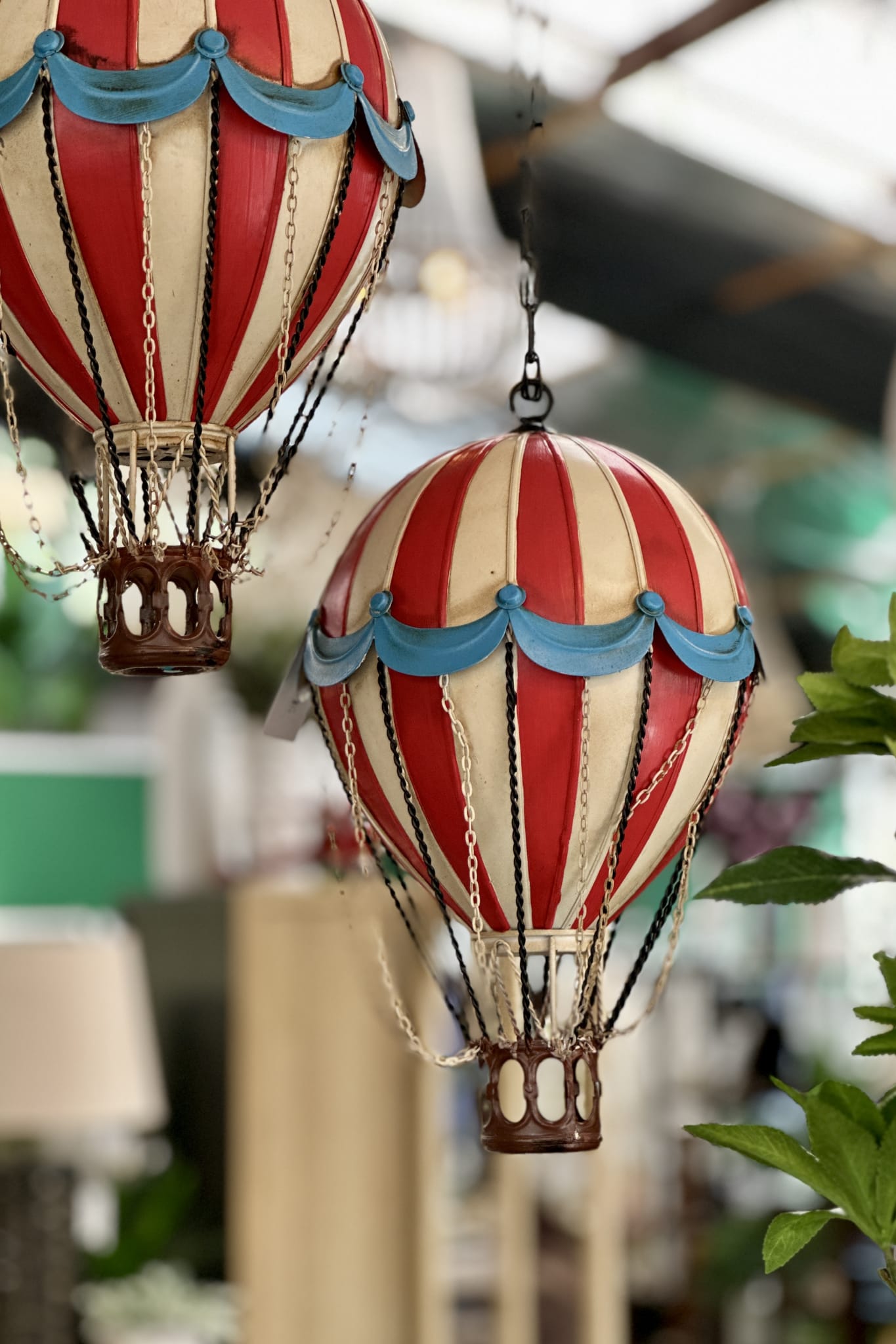A nostalgic hot air balloon with all the charm of old-world travel. With its striped canopy, scalloped trim and delicate chain detailing, it has the look of a vintage carnival piece, that once floated above fairs, fields and storybook skies.