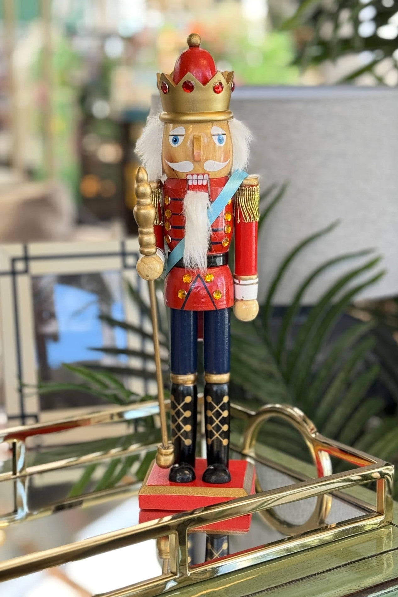 Painted in rich reds, navy blues, and gold, he stands tall with his crown and scepter, ready to reign over your festive displays.