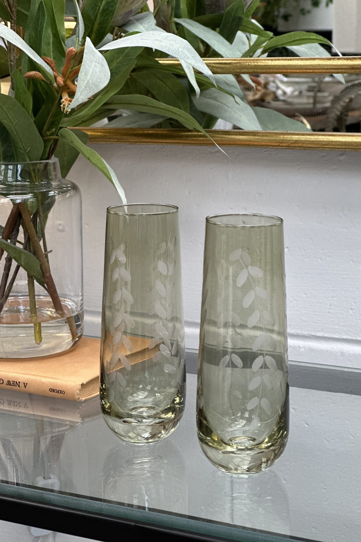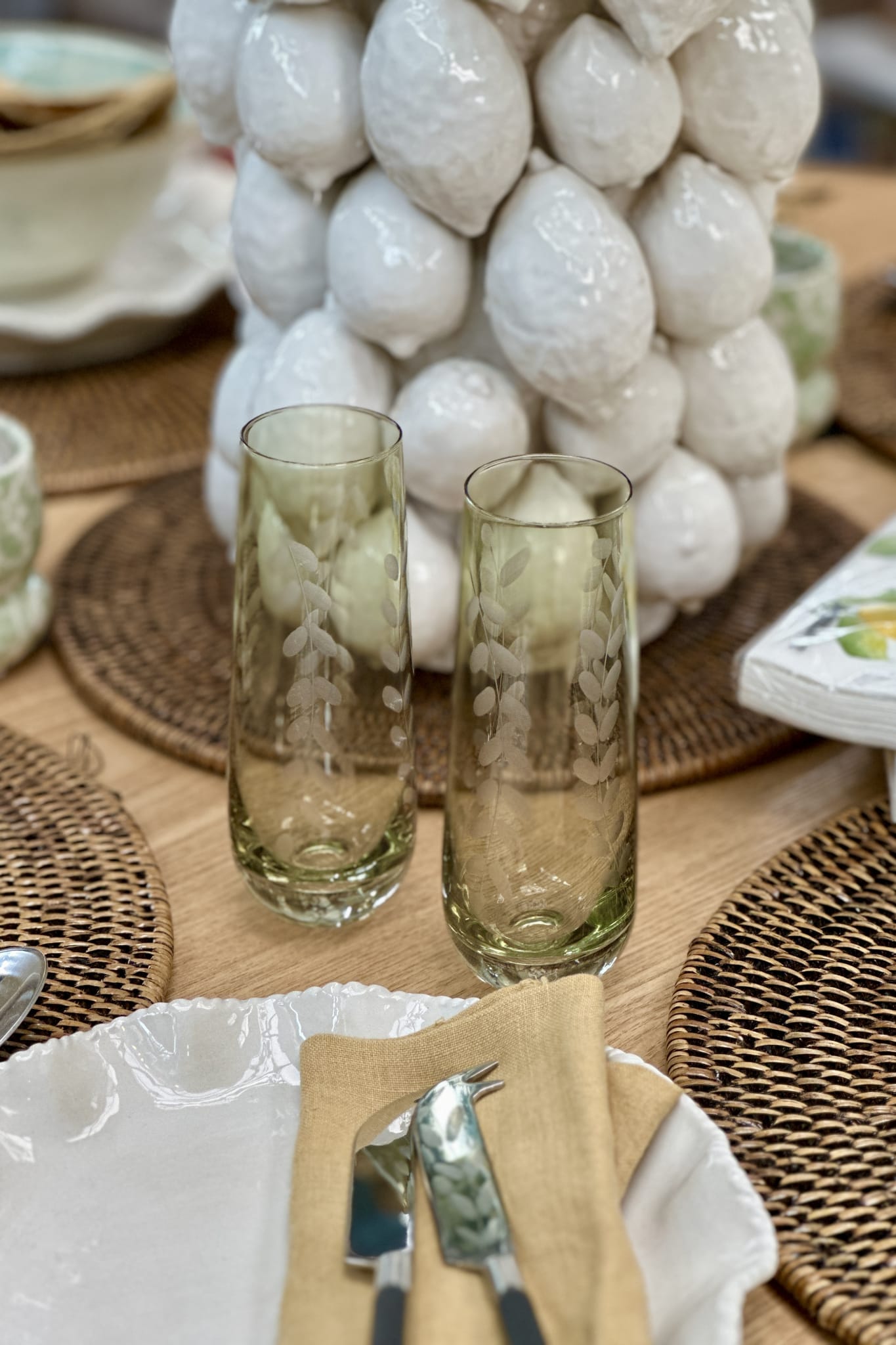 Delicate, yet sturdy in hand, these etched glass tumblers feature a softly frosted leaf motif for a refined botanical touch.
