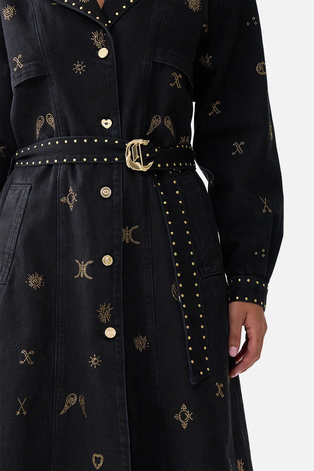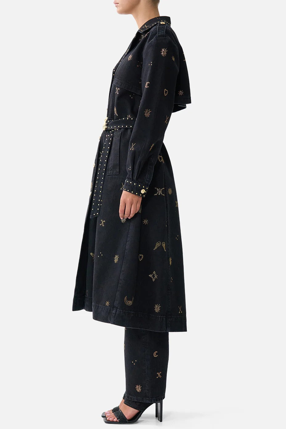 The Heirloom Empire Longline Belted Trench Coat Denim is designed by the Camilla in house artisans and masterfully cut by our manufacturer in Istanbul. A wardrobe staple reimagined, this longline trench coat is crafted from flexible denim with a button front opening for effortless wear. It features front pocket welts, custom camilla hardware and crystal embellishment for luminous detail.
