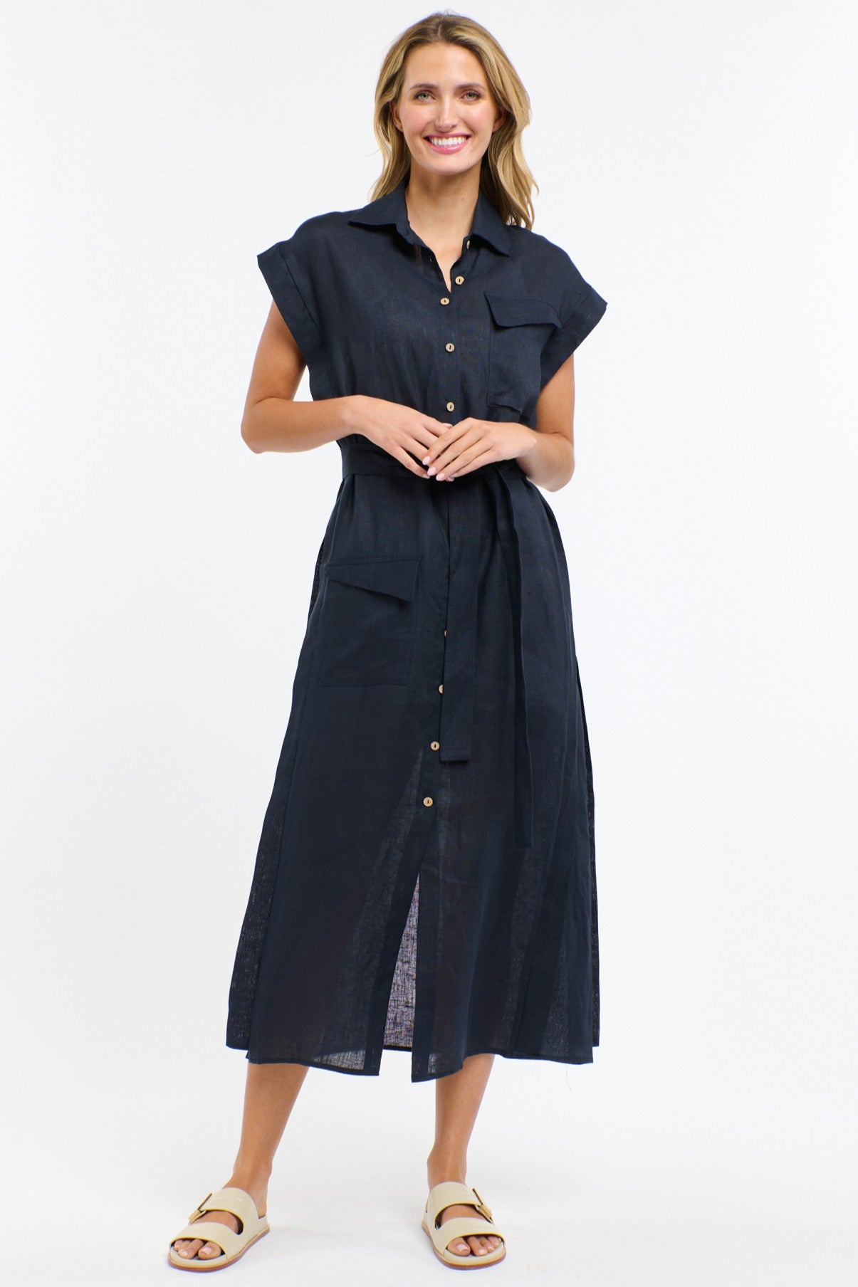 Cool, classic, and made for sun-drenched days, the Estivo Linen Dress is a warm-weather staple. Crafted in breathable 100% linen, this cap-sleeve shirt dress is designed with utilitarian patch pockets, a button-through front, and a self-tie belt to cinch the waist. Its versatile silhouette can be worn loose and relaxed or belted for a more tailored shape — perfect from market mornings to alfresco evenings.