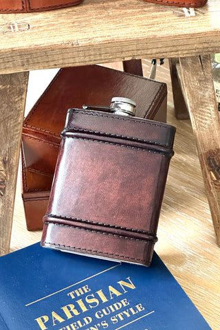 Leather and Stainless Steel Hip Flask with Ridges - Chocolate