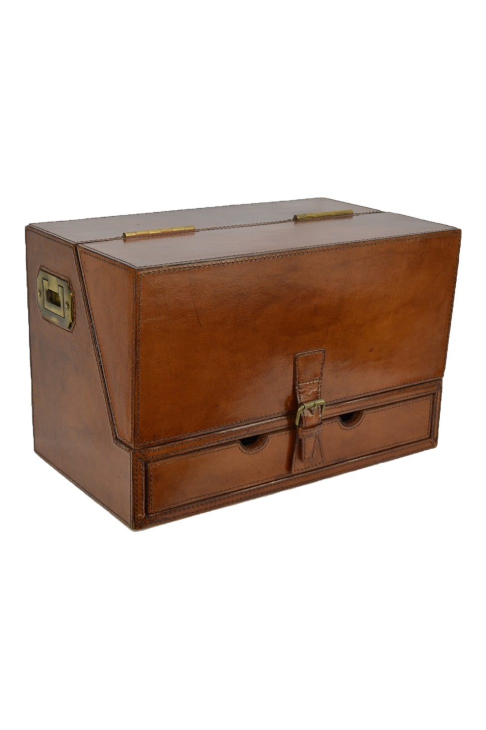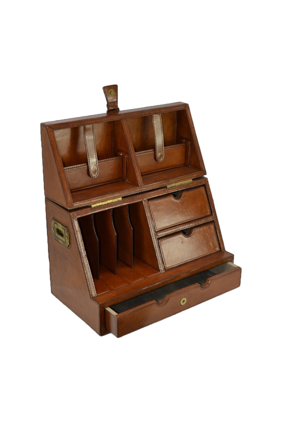A beautifully crafted leather stationery chest designed for the well-ordered desk, featuring multiple compartments, drawers, and dividers to keep letters, notebooks, pens, and daily essentials elegantly in place; its vintage-inspired form, stitched detailing, and warm tan finish bring a sense of classic refinement to any study, home office, or creative workspace.