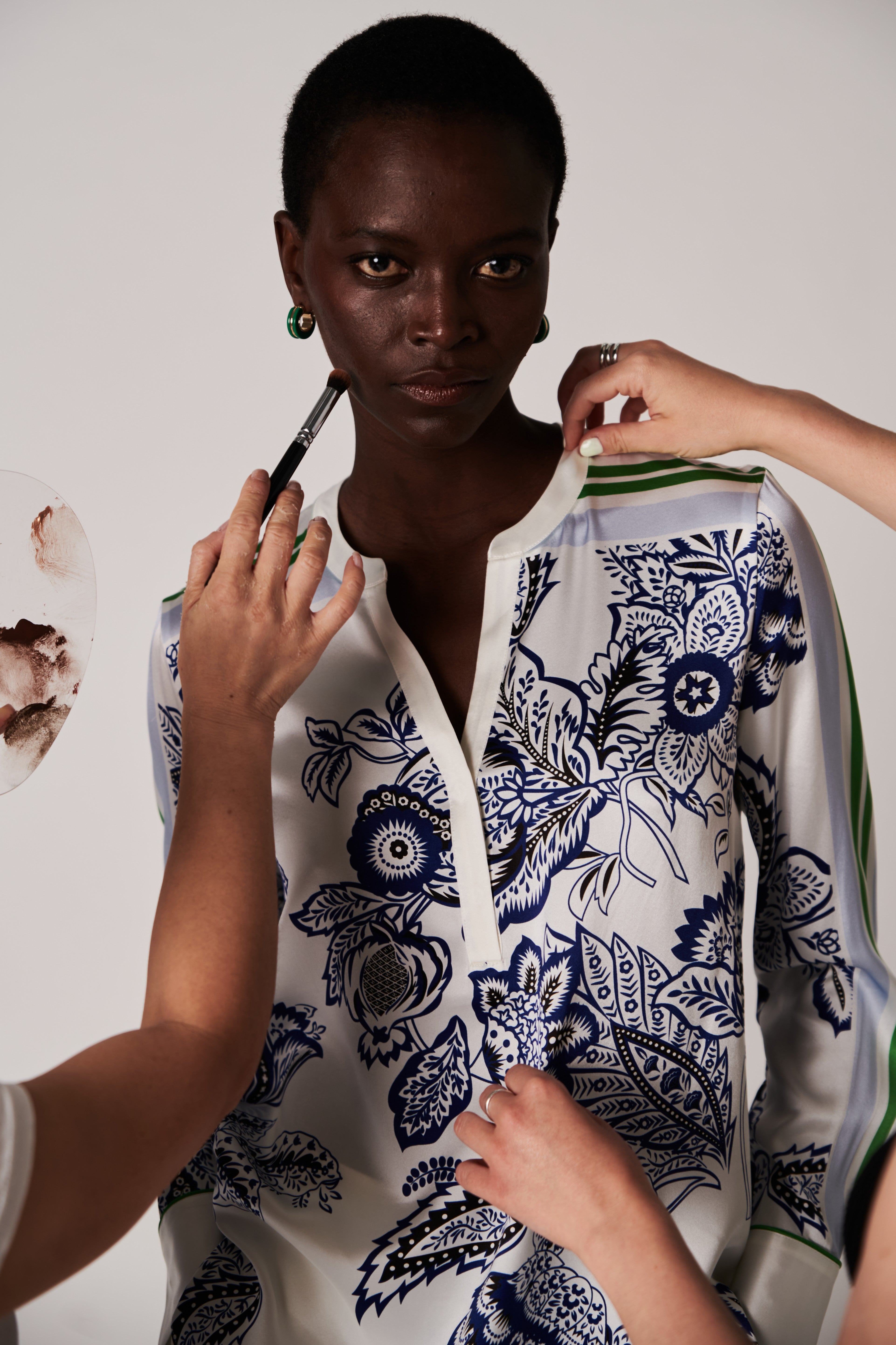 A fresh twist on bohemian luxe, this floral tunic by HERZEN'S ANGELEGENHEIT brings a pop of polished drama to everyday dressing. Crafted in silky viscose with a soft sheen, it features a vibrant navy-and-white botanical print, accented with sporty green stripe detailing at the yoke and cuffs. The fluid silhouette skims gently over the body with a flattering notch neckline and soft blouson sleeves. Pair with crisp white trousers or wear loose over swimwear for an elevated holiday look. Effortless and bold—just like you.