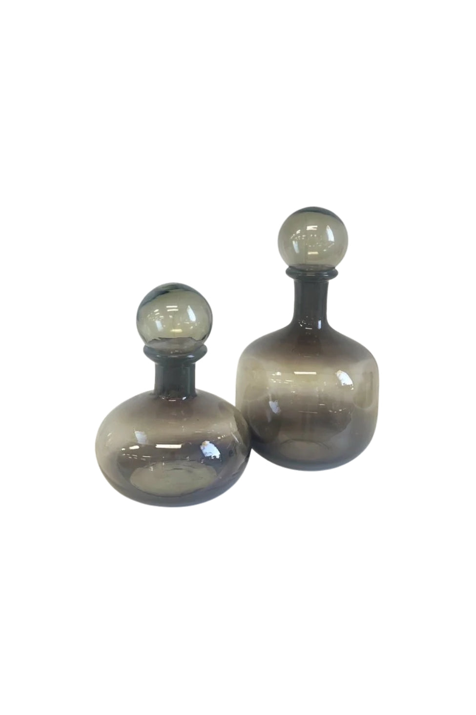 Rounded and dramatic with its oversized stopper, this smoke glass decanter will bring the allure of a luxe cocktail bar into your home. It will add atmosphere and intrigue whether styled on a bar, console or display shelf.
