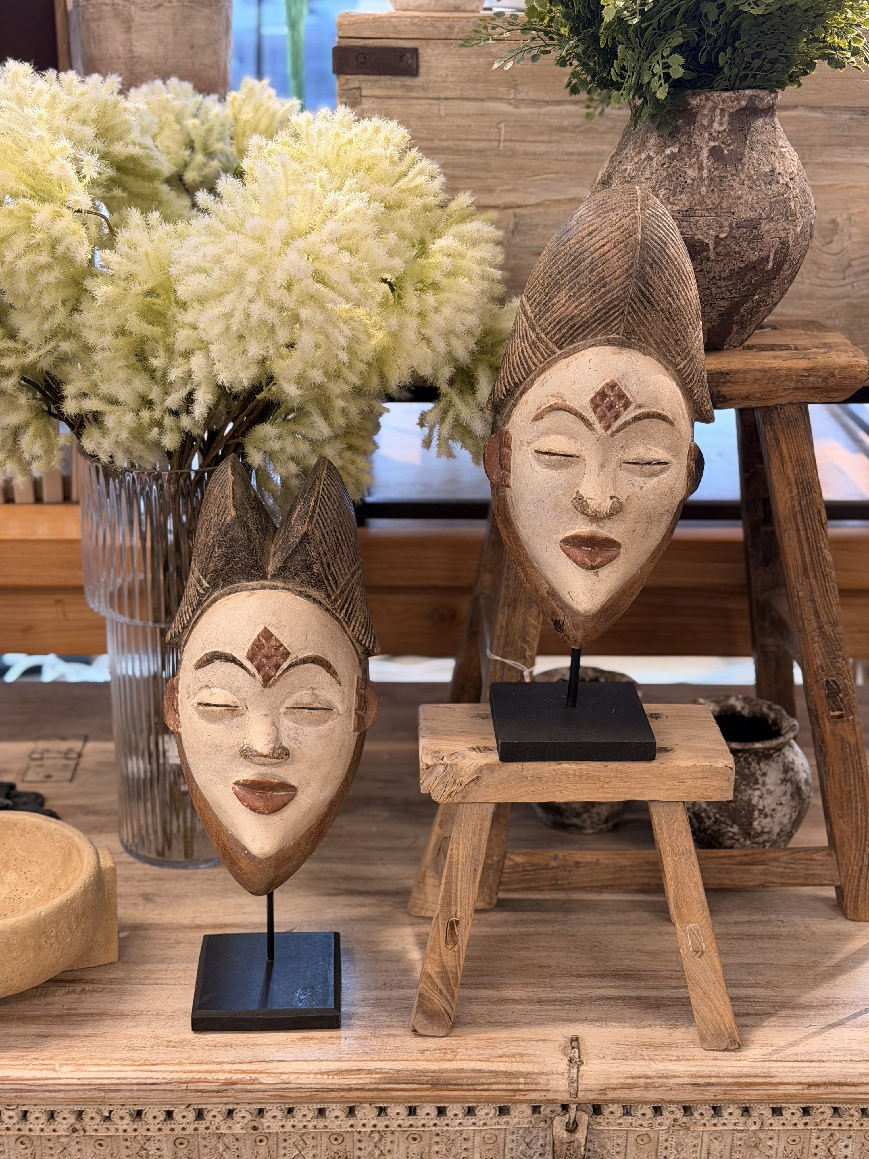 This lovely mask worn by women on ceremonial occasions depict the typical sculptured hairstyle and the scarification pattern on the forehead. They are used by female dancers on stilts at formal traditional celebrations and also funerary rites to invoke the process of reincarnation.