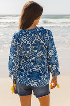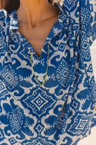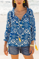 The Santorini Top in the Amalfi Print brings a relaxed, sun-soaked spirit to everyday dressing. Cut in a soft, easy silhouette, it features a gently open neckline with fine contrast trim and tasseled ties, long sleeves with subtle volume, and a fluid drape that sits beautifully on the body. The bold cobalt-and-ivory Amalfi print gives it a fresh Mediterranean feel, perfect with denim shorts, white jeans or loose summer trousers. Light to wear and full of character, this is a piece made for warm days, coastal escapes and that in-between moment from beach to bar.