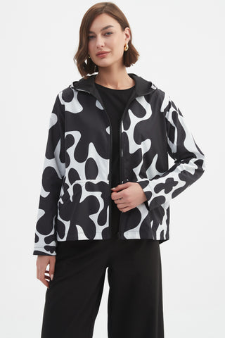 Bring a bold edge to rainy day dressing with the TIRELLI Reversible Windbreaker. Designed in a standout black and cream abstract blot print, this lightweight jacket flips inside out for a minimalist plain-black option—two looks in one. Complete with a hood, side pockets, and long sleeves, it’s the ultimate trans-seasonal layer for those who love statement style and practical design.
