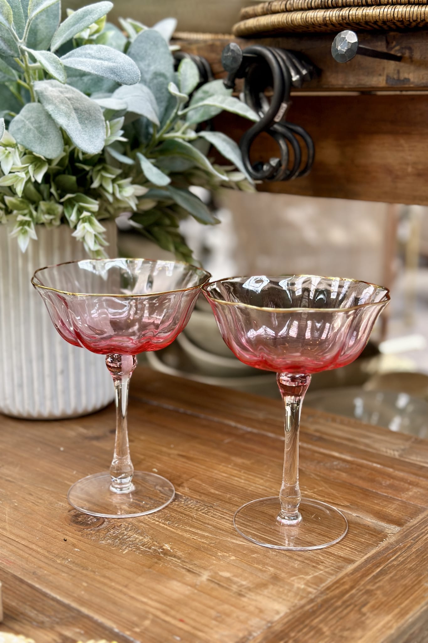 Toast to the art of celebration with this pair of elegant pink coupe glasses. Handcrafted with a delicate blush hue and finished with a fine gold rim, they bring vintage glamour to modern entertaining. Perfect for champagne, cocktails, or a splash of something special, these glasses make every sip feel like an occasion.