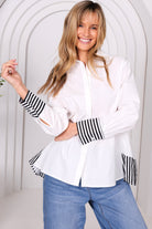 Designed for the woman who loves crisp, confident dressing with a quietly playful twist, the Leoni Kali Shirt brings fresh energy to everyday style while still feeling beautifully considered. The clean white cotton is sharpened with navy stripe detailing at the cuffs and hem, adding interest without ever feeling fussy, while the relaxed silhouette skims the body rather than clinging, creating a flattering, easy shape that feels forgiving and comfortable through the day. Soft structure through the shoulders balances the gentle volume through the body, giving you confidence whether worn loose or partially tucked. Crafted in quality cotton that feels breathable on the skin and holds its shape wear after wear, this is a shirt designed for real life, from lunches and travel days to relaxed work settings and polished weekends. Easy to style with denim, tailored trousers or layered under knitwear, it is the kind of piece that quietly earns its place in your wardrobe, season after season. A beautiful piece to love, wear and truly live in.