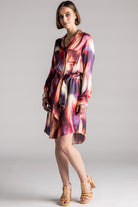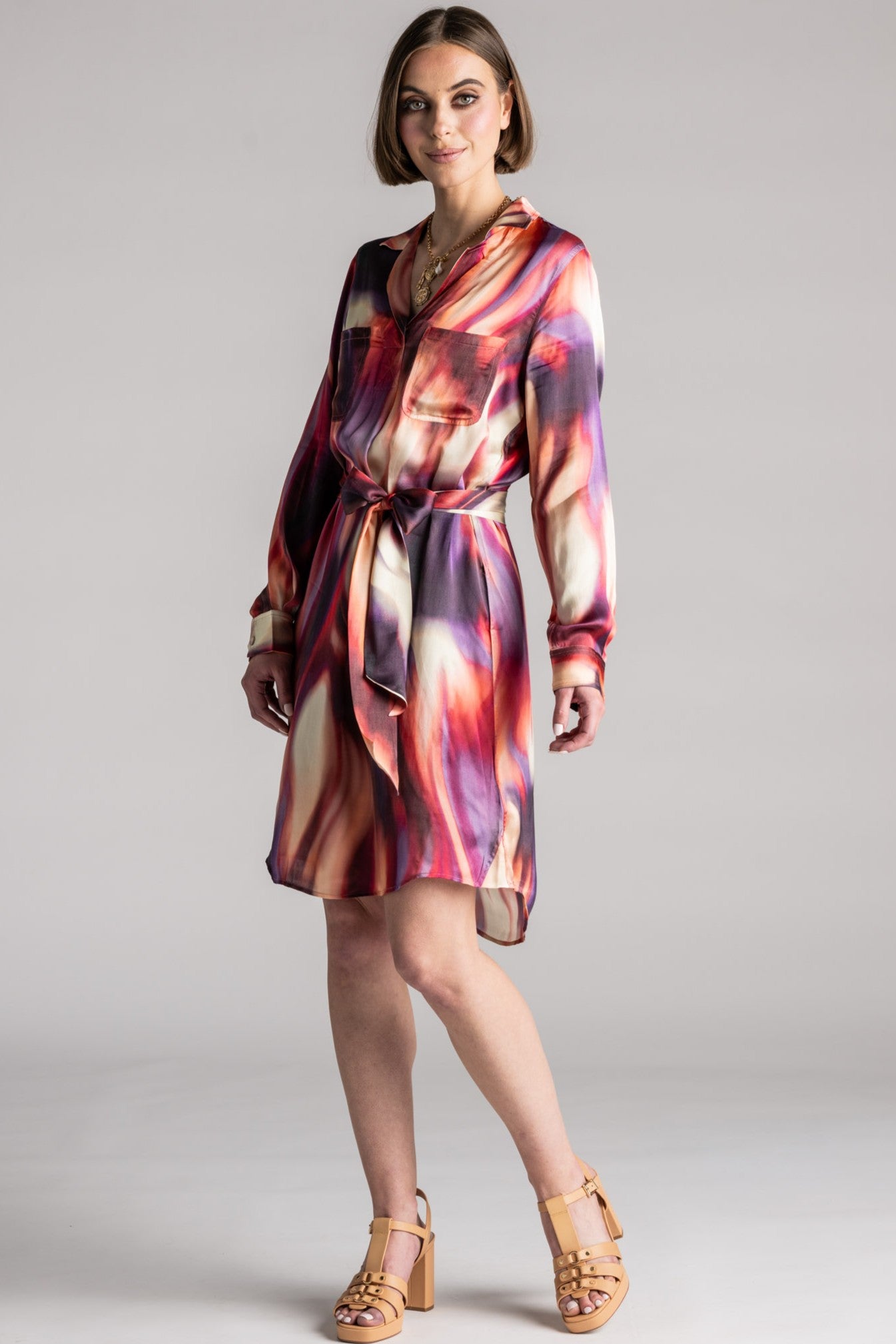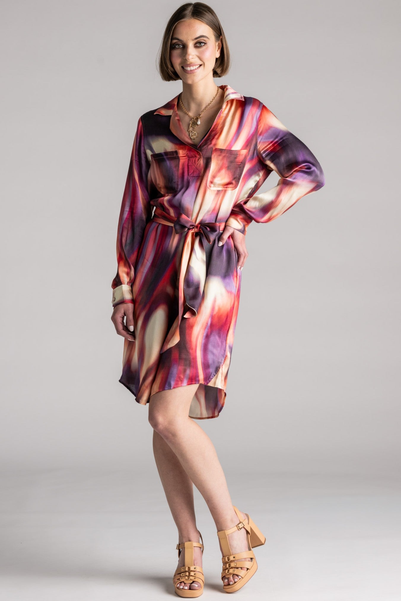 A fiery fusion of colour and sophistication, the Maya Dress by Lauren Vidal brings a confident femininity to the season. With its painterly flame-toned print and flattering shirt-dress silhouette, this piece skims the body in all the right places while offering comfort and fluidity. The self-tie waist belt defines the shape without constriction, while the curved hem adds a soft finish to the structured collar and chest pockets. Pair with heels for a sultry evening look or style down with slides and gold hoops for summer days that call for effortless impact.