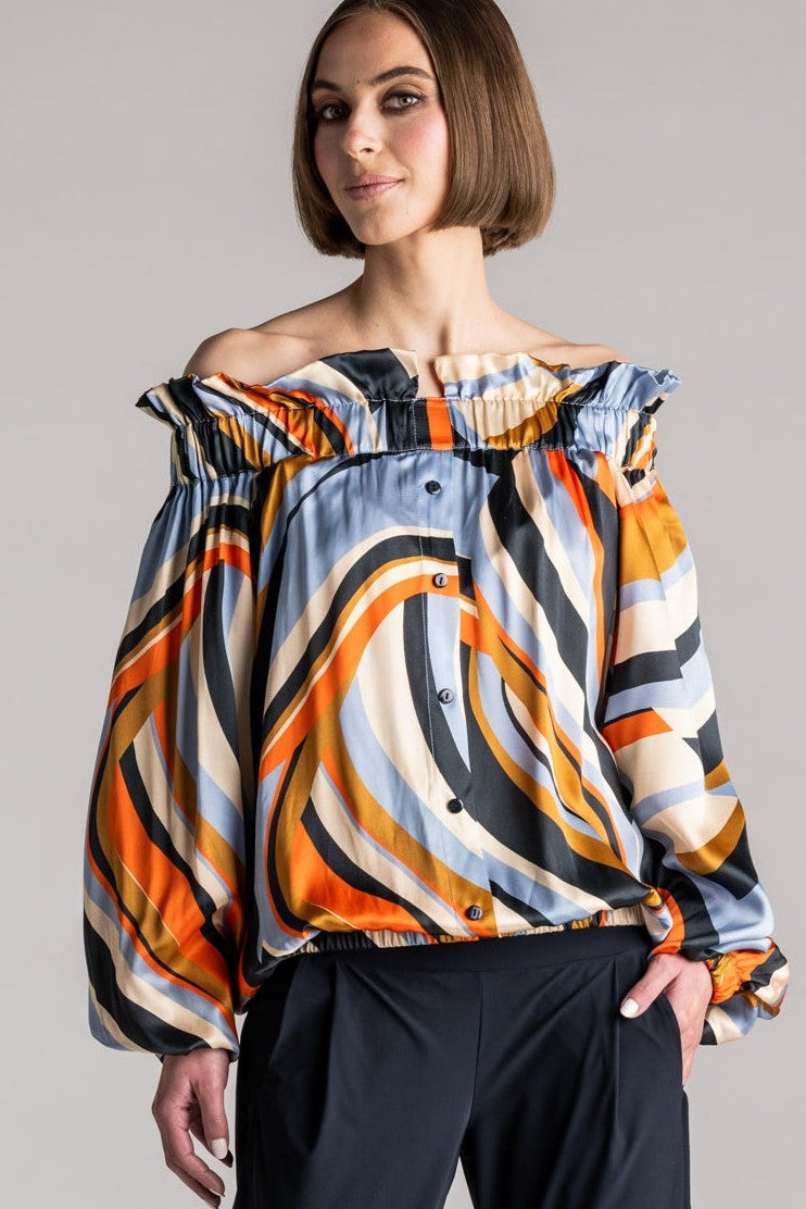 The swirling abstract print brings together burnt orange, amber, blue and soft cream in a palette that feels both retro and fresh. Wear it buttoned up for a refined finish, or off one shoulder for a more playful mood. Looks especially striking paired with black pants or white linen for sun-drenched days and balmy nights.