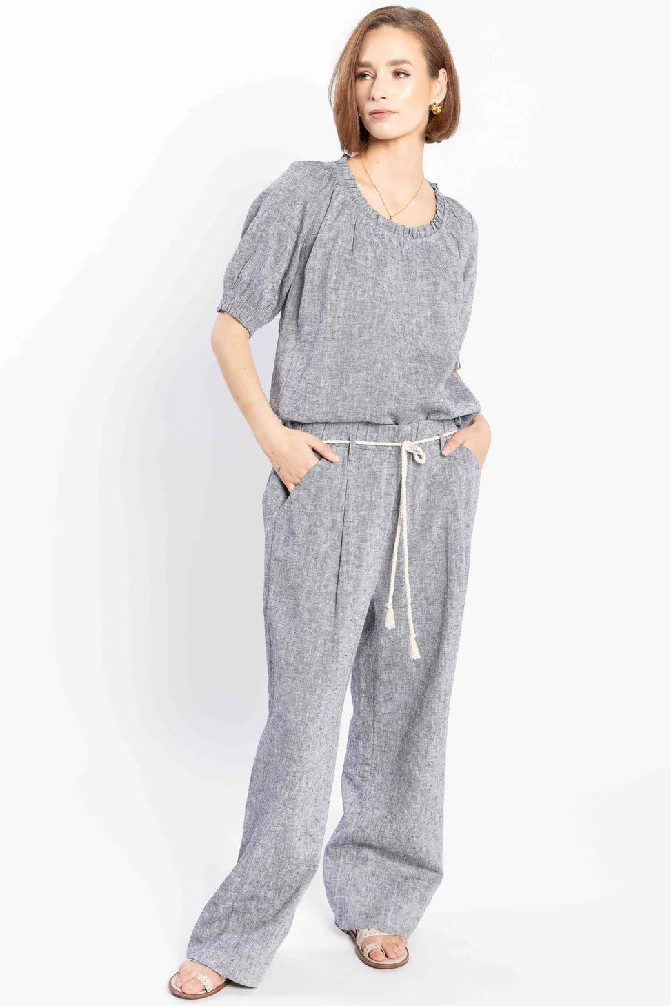 The Mel Blouse from Loughlin is crafted from 100% linen and boasts a stylish scoop neckline with a subtle ruffle detail. This elegant blouse also features short sleeves with elastic cuffs for added comfort and versatility.