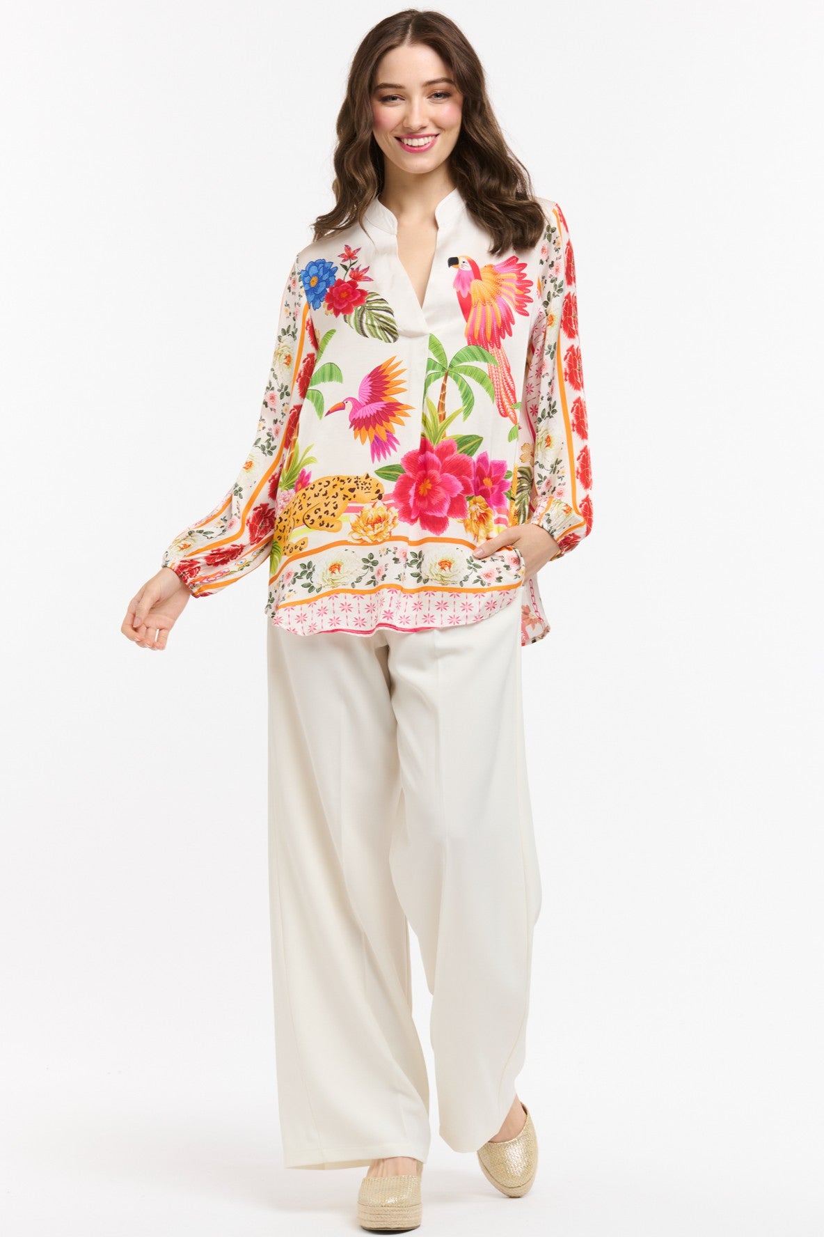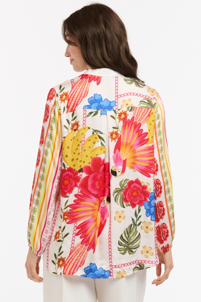 A joyful burst of colour and character, this shirt showcases vibrant parrots, lush botanicals, and playful tropical motifs in striking rose, fuchsia, citrus, and sky-blue hues. Crafted with a soft, fluid drape, it features a refined notched neckline and long sleeves that balance the bold print with clean, modern lines. The pattern continues seamlessly across the back, creating a 360-degree statement that feels both artistic and polished.