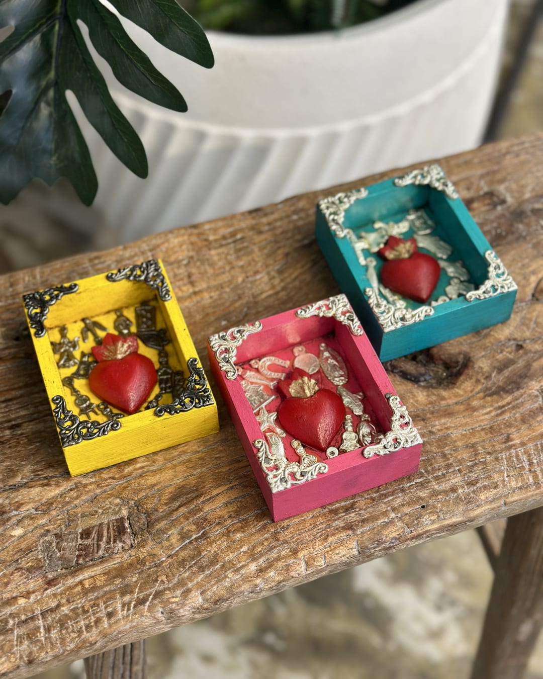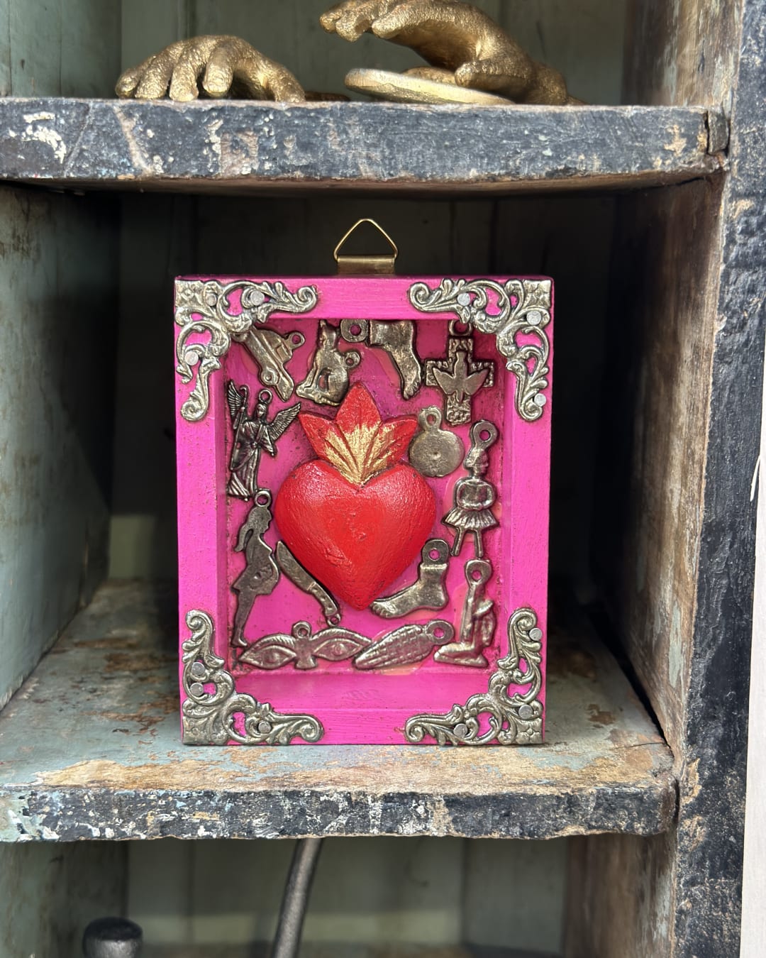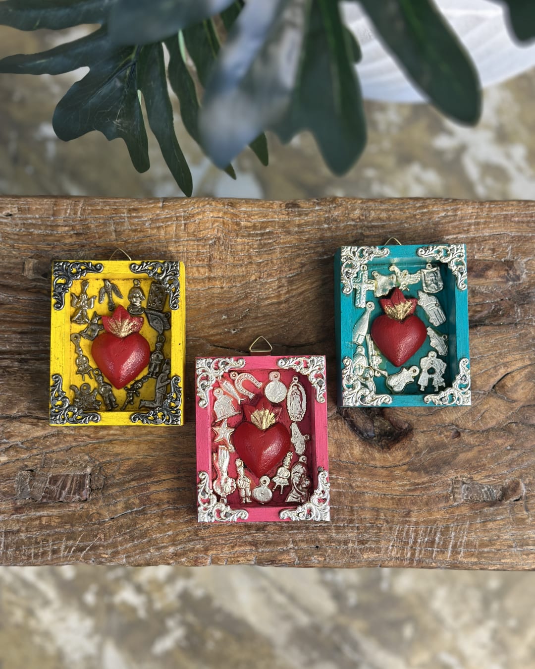 These handcrafted corazones sagrados—or sacred hearts—are beloved icons of Mexican folk art, symbolising love, hope, healing, and miracles. Traditionally used as offerings or tokens of intention, each heart carries a personal story, often adorned with hand-hammered milagros (tiny charms), bold flame motifs, or painted declarations of amor (love).