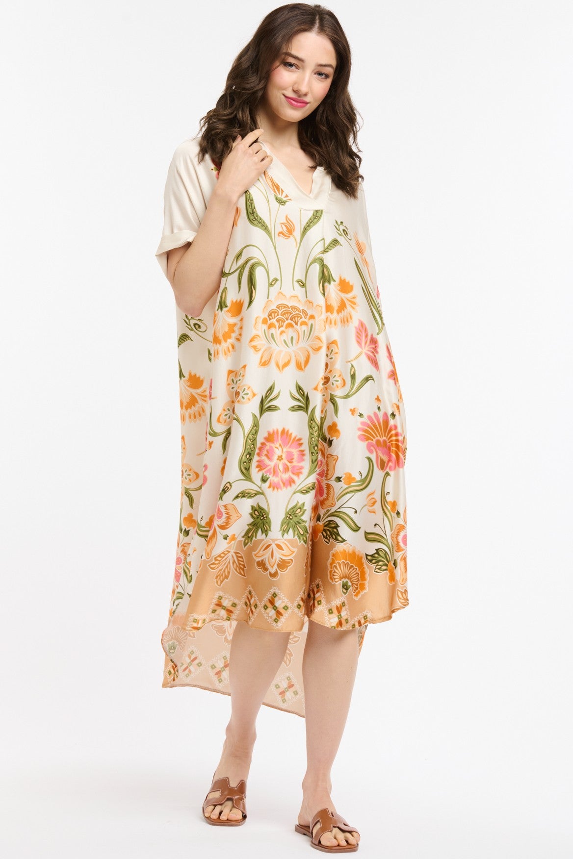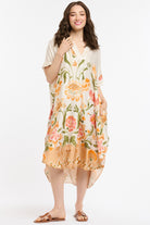 Radiant and full of movement, this dress showcases sweeping floral motifs in warm oranges, greens, and soft pinks against a creamy beige backdrop. The relaxed drape falls beautifully around the body, enhanced by a soft V-neckline and fluid sleeves that keep the silhouette light and modern. A curved, slightly dipped hem adds to its sense of flow, making it ideal for warm days, holiday outings, or any moment that calls for colour and ease.