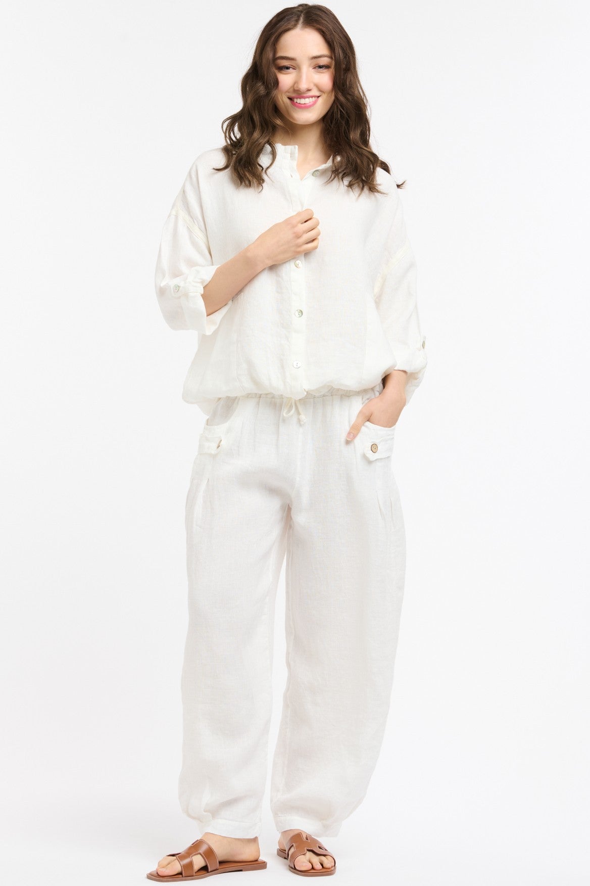 Whether worn with the matching linen bomber or a simple tank, they bring a polished, unfussy feel to everyday dressing.