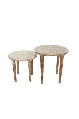 Bring the ornately detailed medina's of Morocco home with this delicately hand carved side table. The natural tones and grain found in the timber are finished with a soft white wash to highlight the floral exotic botanical motifs.