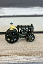 This vintage-style cast iron tractor, painted in deep green with a charming little driver, celebrates the golden days of farm life. A delightful piece for collectors or rustic décor lovers, it brings a touch of pastoral nostalgia to shelves, desks, or display cabinets.