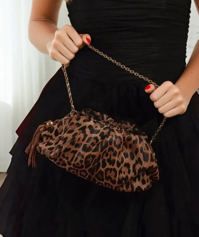 This beautifully proportioned pleated pouch makes a statement with its super stylish leopard print leather. Suited for both day and night, It can be carried as a clutch/wrist bag with the shorter metal chain or worn as a crossbody with the longer adjustable matching leather strap. Both straps are detachable, and the pouch has a square clam snap closure.