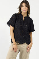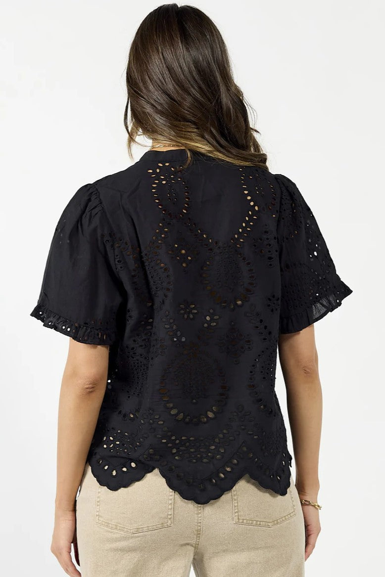 Elevate your summer wardrobe with the must-have Pip Top by Drama the Label. This stunning piece features delicate Embroidery Anglaise, a flattering V Neck, and Short Sleeves with charming frill detail. The scallop hemline adds a beautiful touch that pairs perfectly with shorts, skirts, or pants. Add a touch of elegance and sophistication to your summer look with the Pip Top.  Also comes in White.
