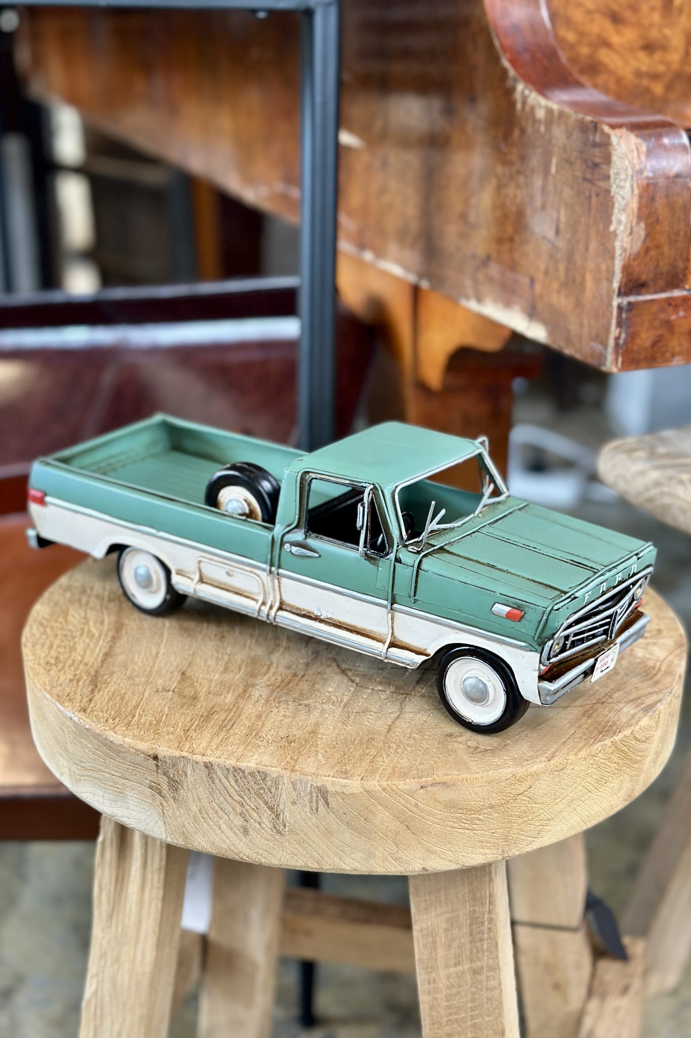 A vintage-style Ford truck in classic green and white, full of old-school charm. The deep green body paired with crisp white side panels and a matching cab roof gives it that unmistakable heritage Ford look — the kind once seen rolling through farming towns, hauling goods and turning heads on country roads.