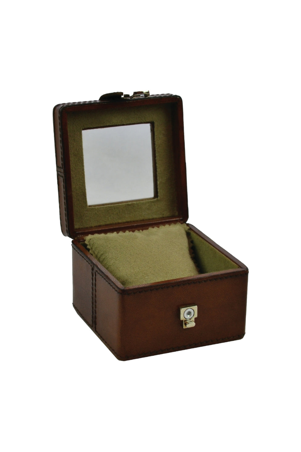 A compact tan leather watch box lined in soft suede, designed with a cushioned interior and built-in mirror to keep your favourite timepiece safely stored and beautifully presented.