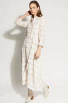 Introducing the exquisite Camille Dress in Waffle Check - a sophisticated collared shirt dress that exudes elegance. This dress features a half placket adorned with pockets, long sleeves with charming gathered details at the top, and convenient side pockets. To accentuate your figure, it comes with a self-tie belt, all while maintaining a flattering midi length. Additionally, this dress is lined, ensuring both comfort and quality. Elevate your wardrobe with the timeless and refined Camille Dress in Waffle Check.