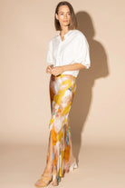 Silken Skirt in Water Colour! This stunning skirt boasts a beautiful array of colors, thanks to its expertly biased cut. Not only is it visually appealing, but it also features a super flattering elastic waistband for a comfortable fit. The skirt's maxi length and front side split add an extra touch of elegance to any outfit. For a perfectly coordinated look, we recommend pairing it with our Delfoy Blouse (style number: 1241L). Elevate your wardrobe with this sophisticated ensemble that exudes both style and grace.