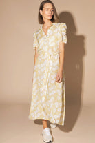 The exquisite Sylvie Dress in Limoncello, a stunning tea-style dress in a beautiful lemon hue adorned with delicate white flowers. This dress boasts charming features such as ruched puff sleeves, a button-down bodice, a self-tie belt, and convenient pockets. Its midi length adds an elegant touch to the overall design. To ensure utmost comfort and modesty, this dress comes complete with a full cream slip. Elevate your wardrobe with this sophisticated and timeless piece.