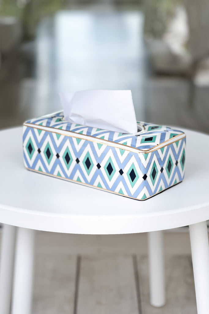 Sixties inspired ceramic tissue box cover. Simply place over a standard tissue box to elevate a bathroom or counter space.