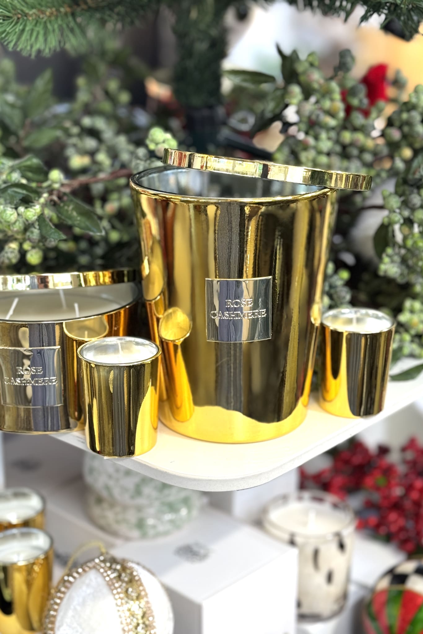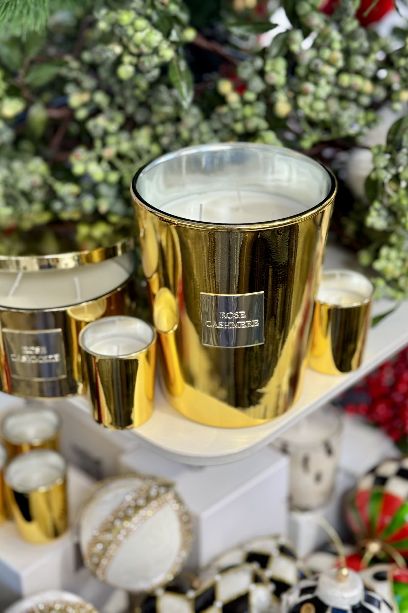 A showpiece of festive indulgence. This grand triple-wick candle glows like liquid gold, filling the room with the sensual scent of rose and cashmere.