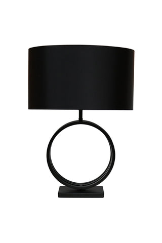 The Maranello Lamp is a modern sculptural statement with its striking jett-black rings and matching black oval shaped shade.