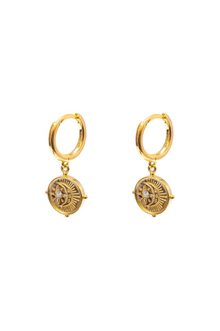 'Moon and Star' huggy style hoop earrings featuring a filigree style charm centred with a gemstone for a hint of sparkle.