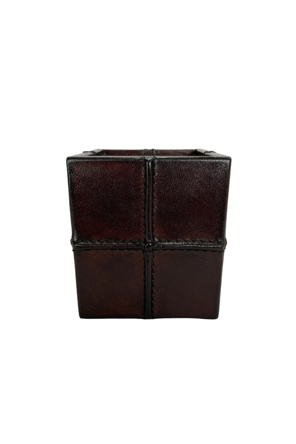 A dark leather pen holder with hand-stitched panel detailing, bringing a touch of refined, old-world craftsmanship to any desk or workspace.