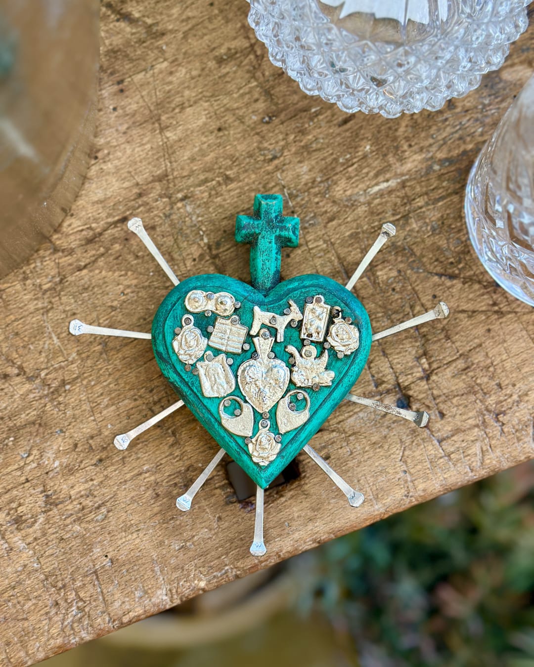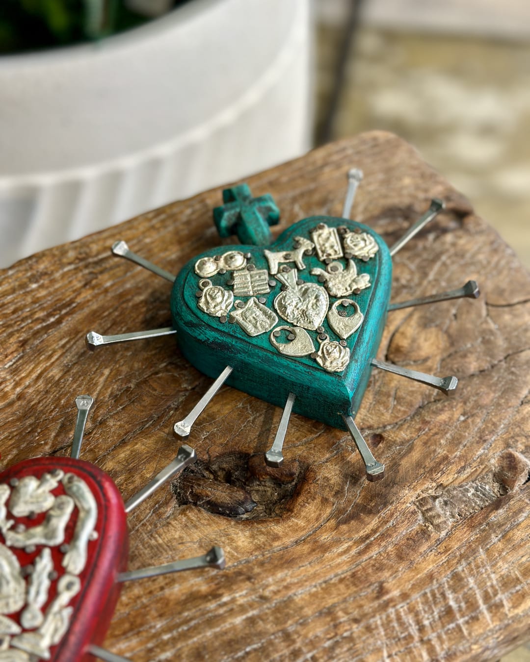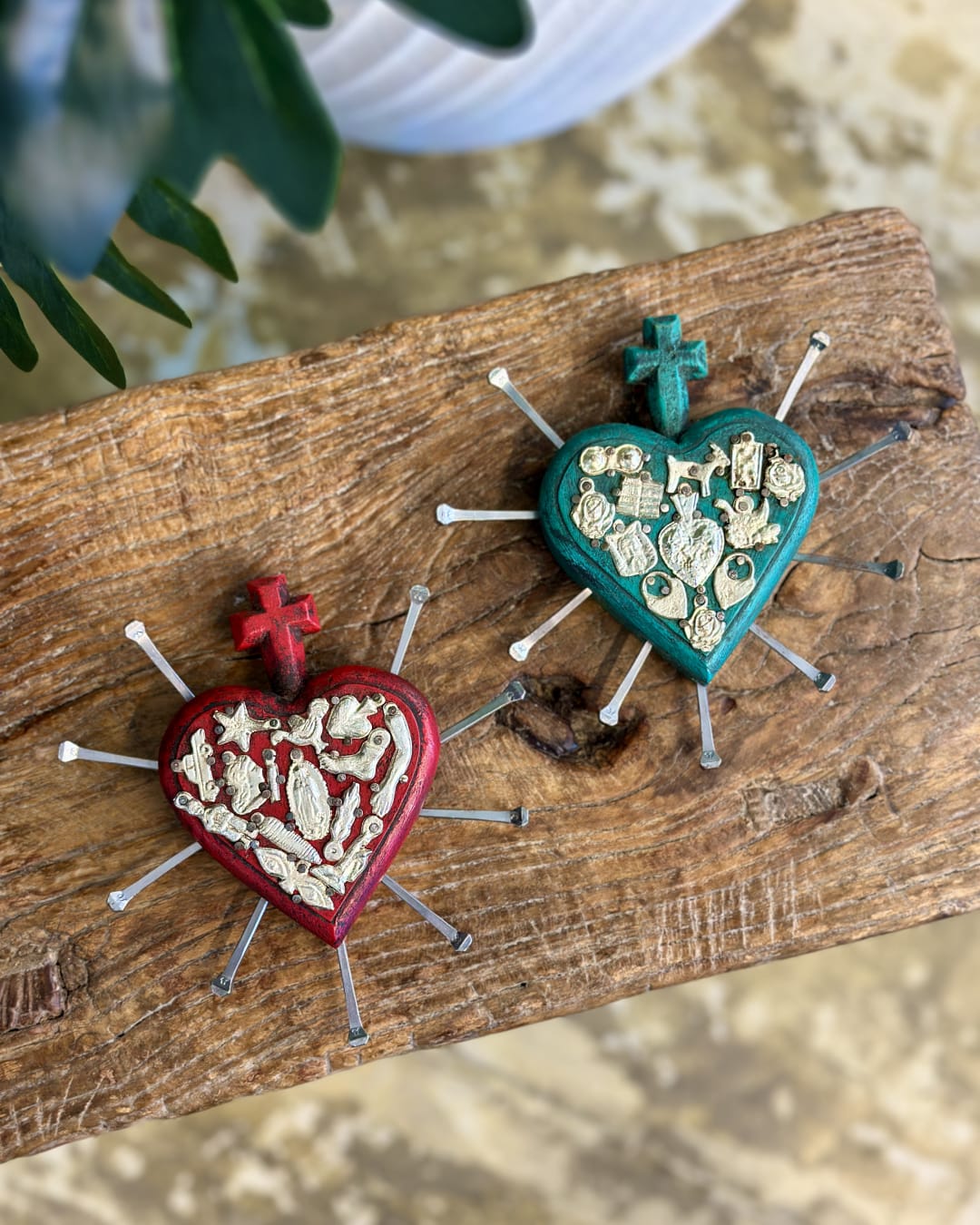 These handcrafted corazones sagrados—or sacred hearts—are beloved icons of Mexican folk art, symbolising love, hope, healing, and miracles. Traditionally used as offerings or tokens of intention, each heart carries a personal story, often adorned with hand-hammered milagros (tiny charms), bold flame motifs, or painted declarations of amor (love).