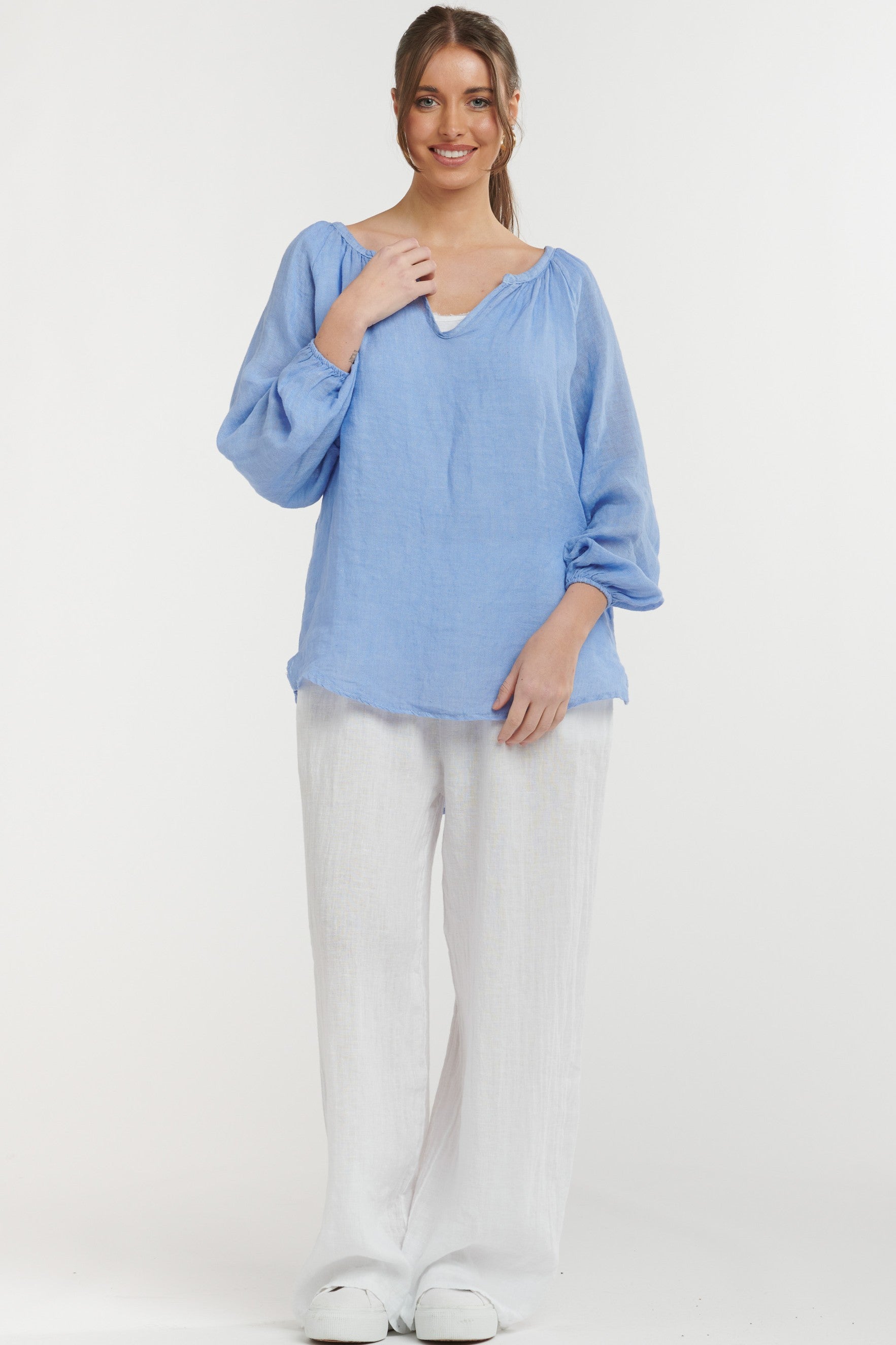 Light, airy, and beautifully relaxed, this linen top brings an easy softness to warm-weather dressing. The gathered neckline creates a gentle scooped shape, while the billowed sleeves add volume without overwhelming the silhouette. Crafted in breathable linen with a subtly curved hem, it’s the kind of piece that feels effortlessly wearable — simple, flattering, and perfect for pairing with linen pants, denim, or summer skirts.