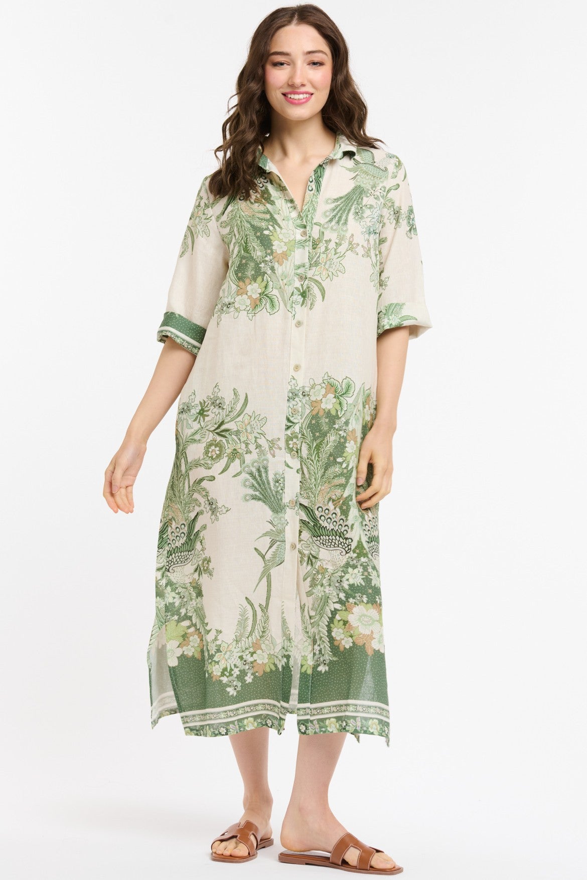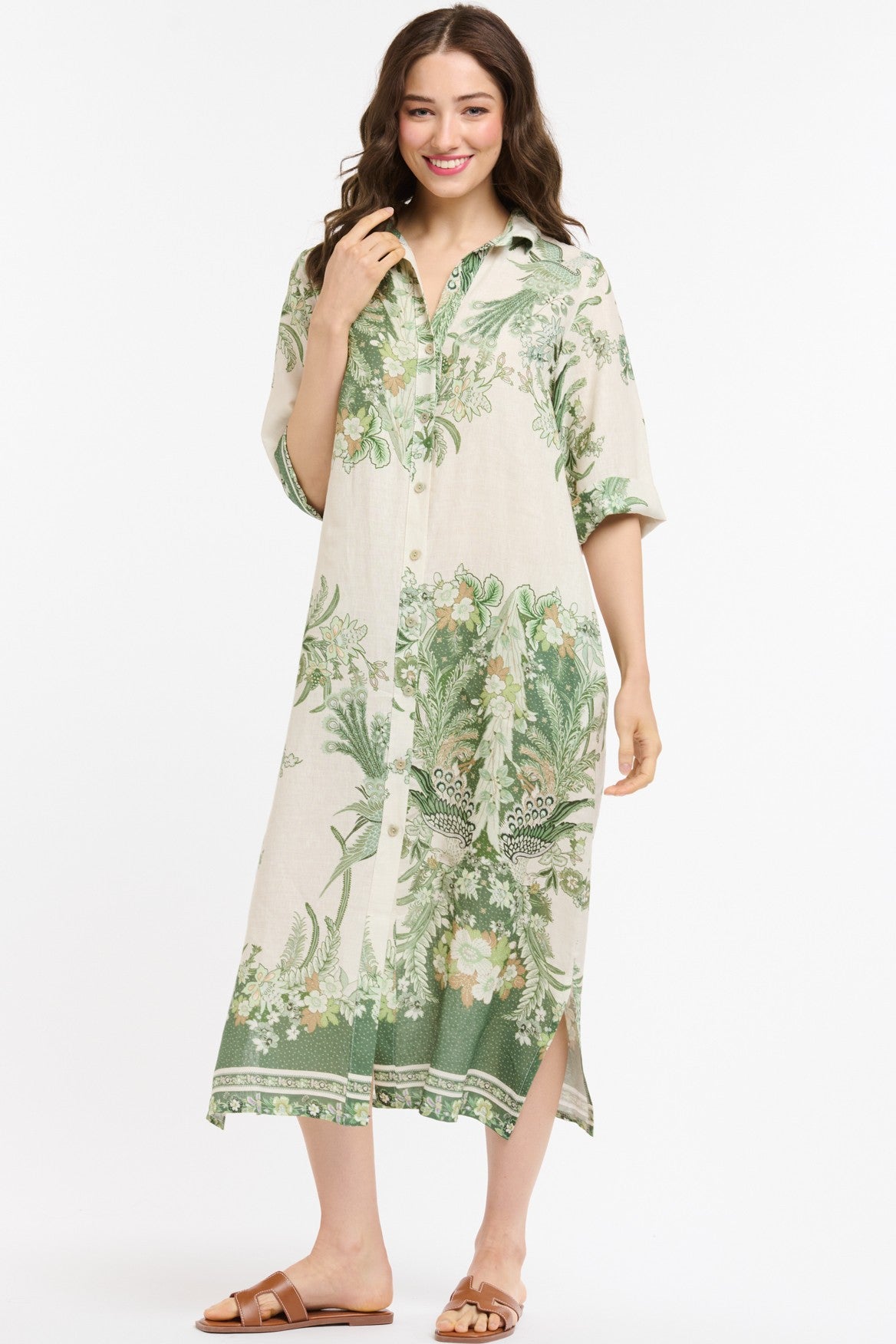 Fresh and quietly striking, this linen dress showcases an intricate botanical print in soft cream and layered shades of green. The button-through design and subtle collar bring a touch of structure, while the relaxed silhouette and mid-length cut keep the look easy and modern. Gentle sleeve detailing and a beautifully placed border print add refinement without feeling fussy.