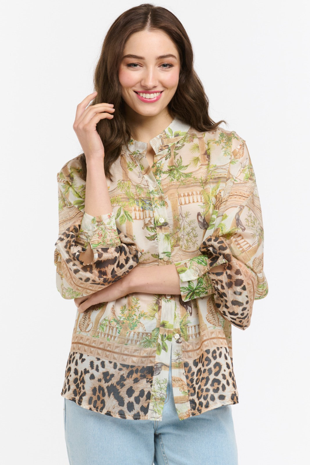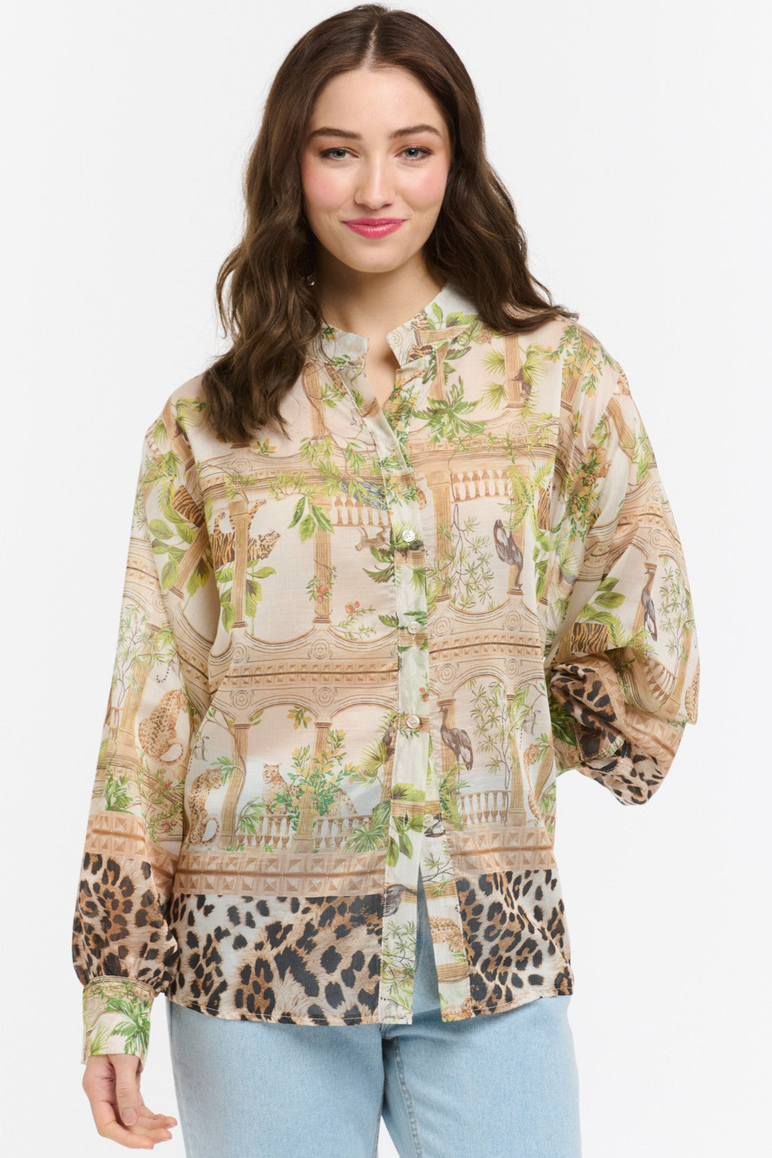 A statement shirt that blends safari charm with an artful, contemporary finish. The Wild Shirt features a striking mix of botanical sketches, architectural detailing and leopard accents, all set against a soft cream base that keeps the print feeling elevated rather than loud.