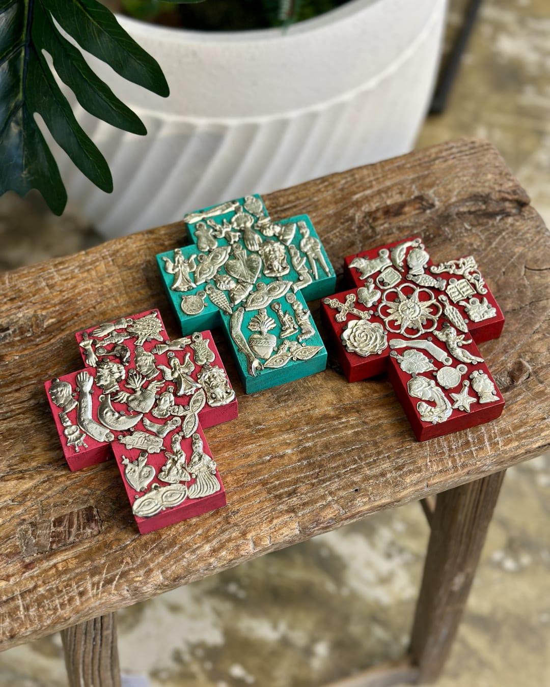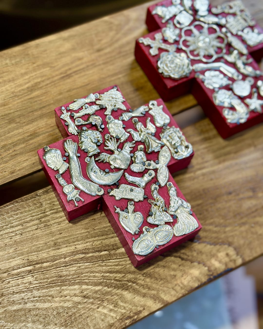 Adorned with tiny metal charms, no two are the same. Whether crafted from rustic wood, detailed tin, or Talavera tile, each cross is a unique token of intention—equal parts artwork and amulet.